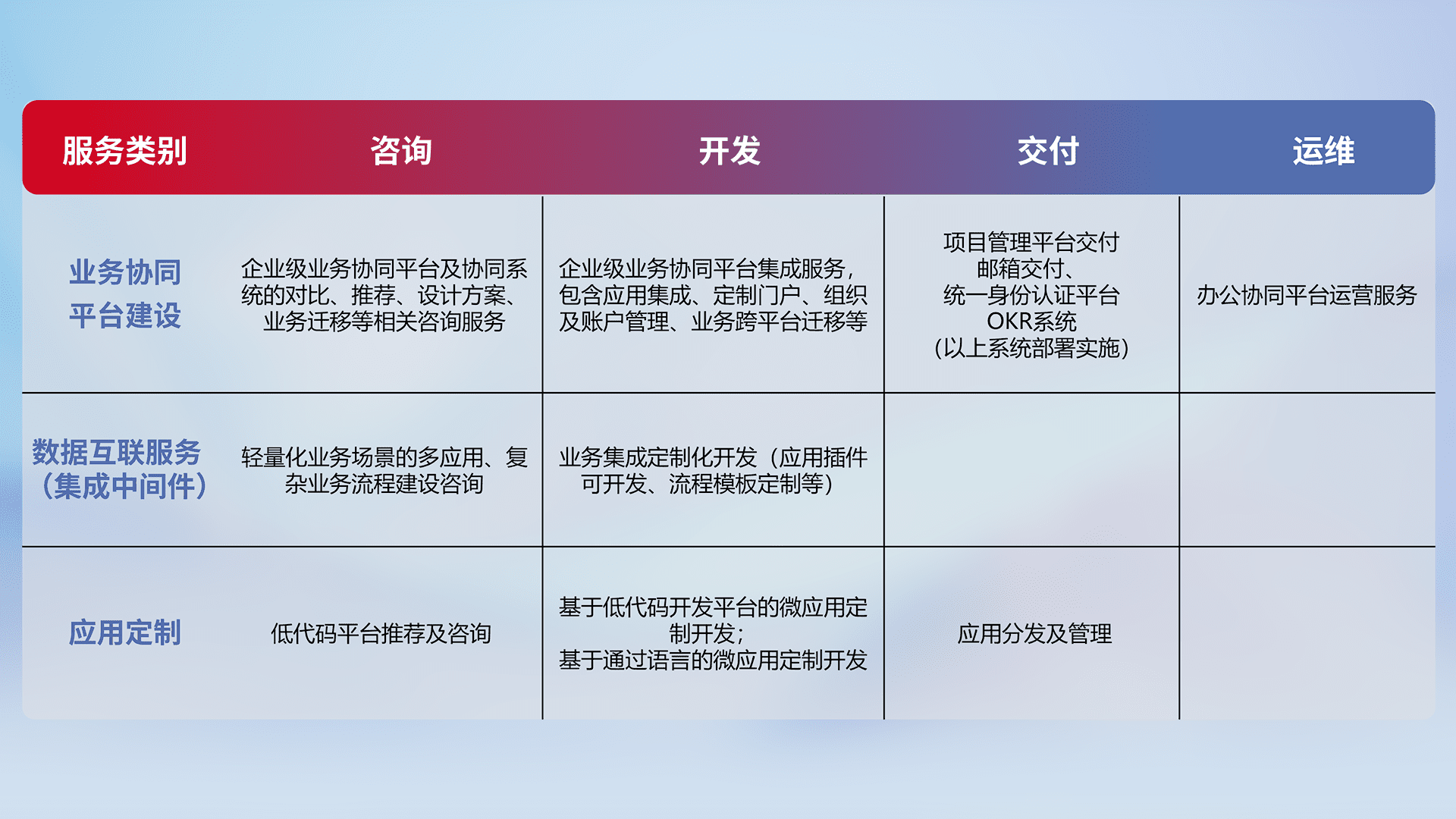 针对钉钉、、企微、、、、IDaas等平台级产品提供产品的规划、、、方案、、、交付、、、定制化开发等服务,,,实现如统一协同办公、、智能客户服务、、、混合会议管理、、、智能数据查询、、、等业务场景,,,实现数字化转型。。。