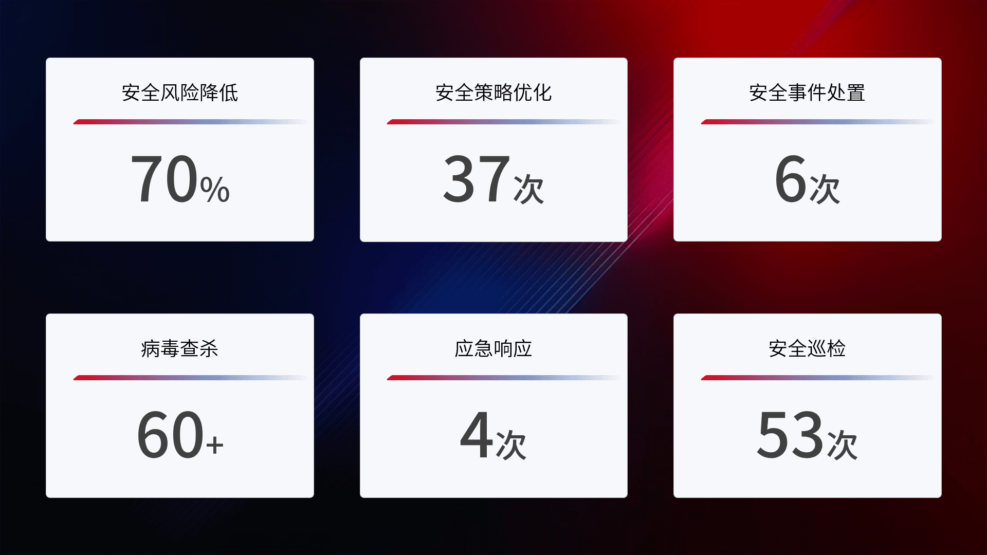 提供全面的安全事件报告体系,,包括处置报告、、、、周报、、季度和年度总结,,,,结合持续监控,,,帮助客户深入了解网络安全状况。。