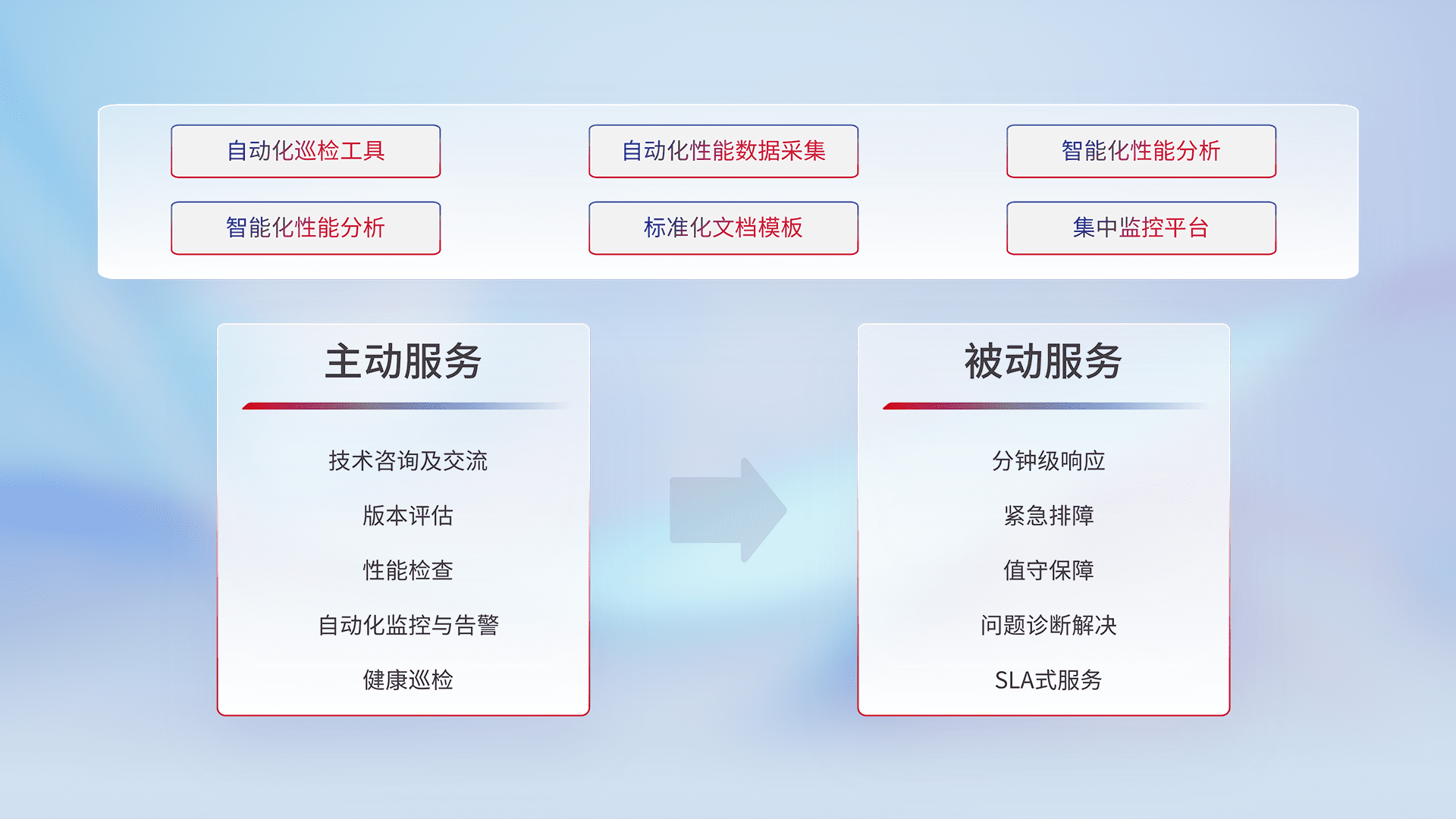智能化工具和标准化文档,,,,保障服务质量,,提供主动服务(包含技术咨询、、、版本评估、、、性能检查、、、、自动化监控与告警、、、健康巡检)和被动服务包含(分钟级响应、、、、紧急排障、、、、值守保障、、、、问题诊断解决、、、SLA服务)。。。。